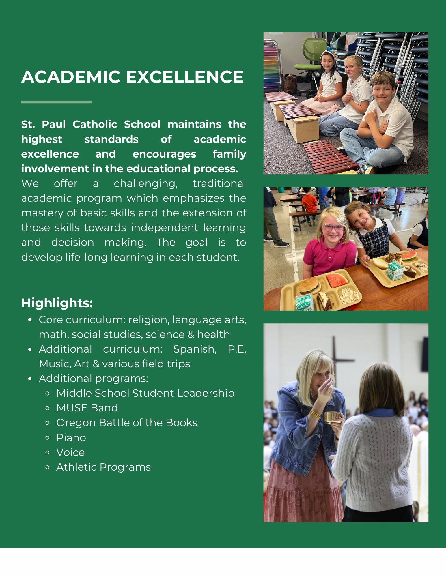 We believe this growth is fostered through the partnership between home and school. St. Paul Catholic School has a comprehensive, challenging curriculum that promotes life-long learning and emphasizes respect, personal responsibility, and service. Our goal is to educate each child, in partnership with parents, in the ways of Christ, and to begin the journey to being a responsible, kind and caring individual.