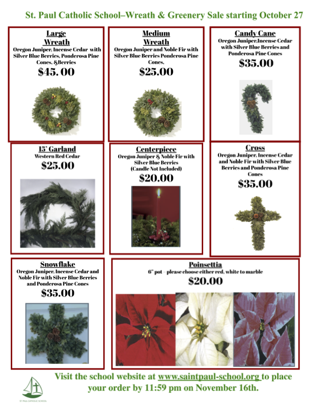 St. Paul's annual wreath sale will kick off on Monday, October 27th. The final day to place your order is Sunday, November 16th @ 11:59pm.